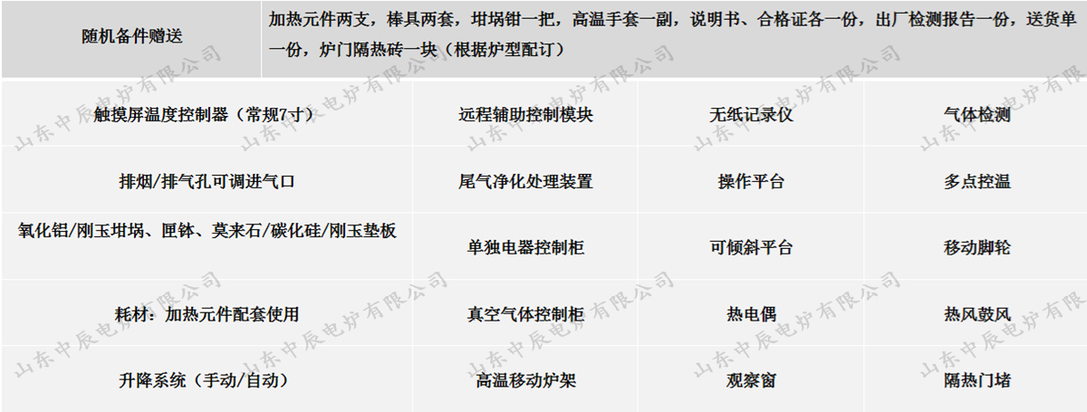 加熱元件兩支,棒具兩套,坩堝鉗一把,高溫手套一副,說明書、合格證各一份,出廠檢測(cè)報(bào)告一份,送貨單一份,爐門隔熱磚一塊(根據(jù)爐型配訂) |
